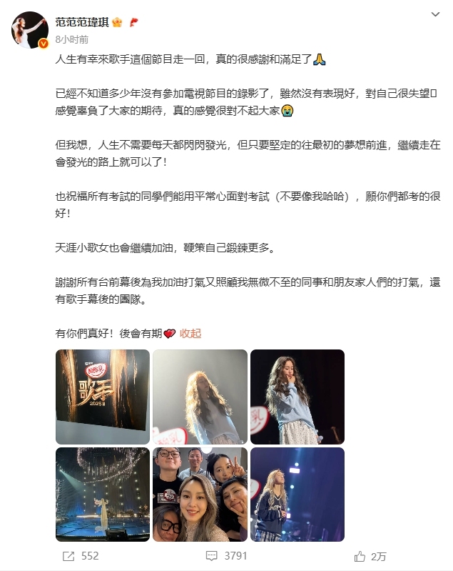 “范玮琪声音好抖”冲上热搜,《歌手2025》范玮琪被淘汰,现场回应:“说不紧张是骗人的,我也是虚心接受”